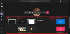 When sharing content in Teams meetings, you control what others can see. You can decide whether you need to show your entire desktop, or just a specific window. If someone is sharing their desktop or an application, you can request the presenter to give you control. You can decide to share your desktop, a window, a previously opened PowerPoint in Teams, a browser page or a whiteboard session.